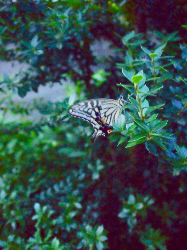 どういうことだろう・・・と思い外に出てみました。そうしたら、木にパッと止まり、今度はそこからまったく移動しようともせず、美しい文様の羽を優雅にゆっくりパタパタと開いたり閉じたり。そのうちにじ〜っとこのポーズ。近寄っても怖がる様子もなく。これはきっと誰かのご挨拶なんだと思いました。