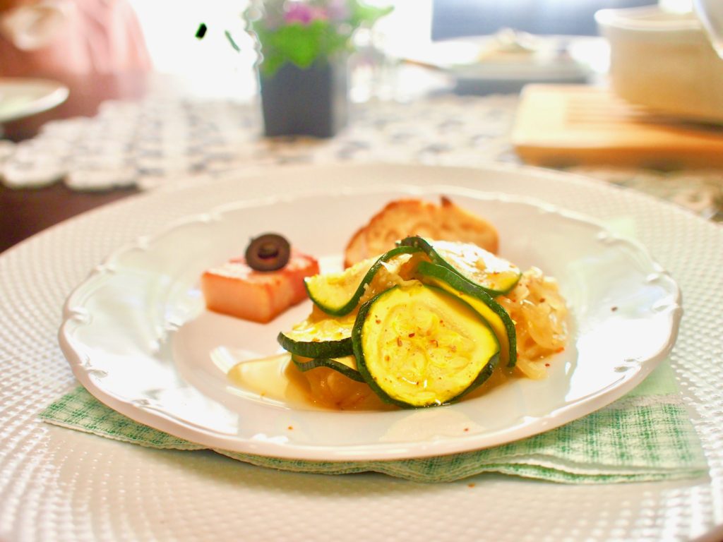 ニンニクたっぷりの玉ねぎのコンポート。こんがりローストのズッキーニ。その他もろもろ。