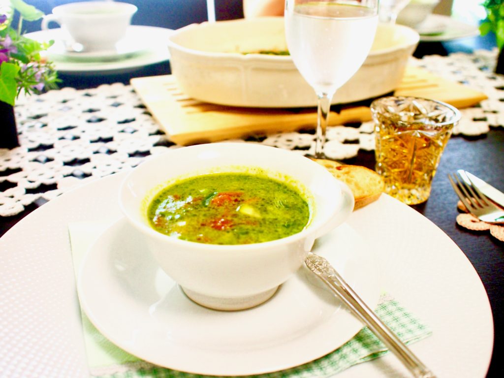 スプーンでスープをすくうと、グリーンの色の中から、多色の、美しい色彩をしたお野菜たちが顔を出してくれます。いただく私たちの感覚を、キレイな色と香りで喜ばせてくれるお料理です。