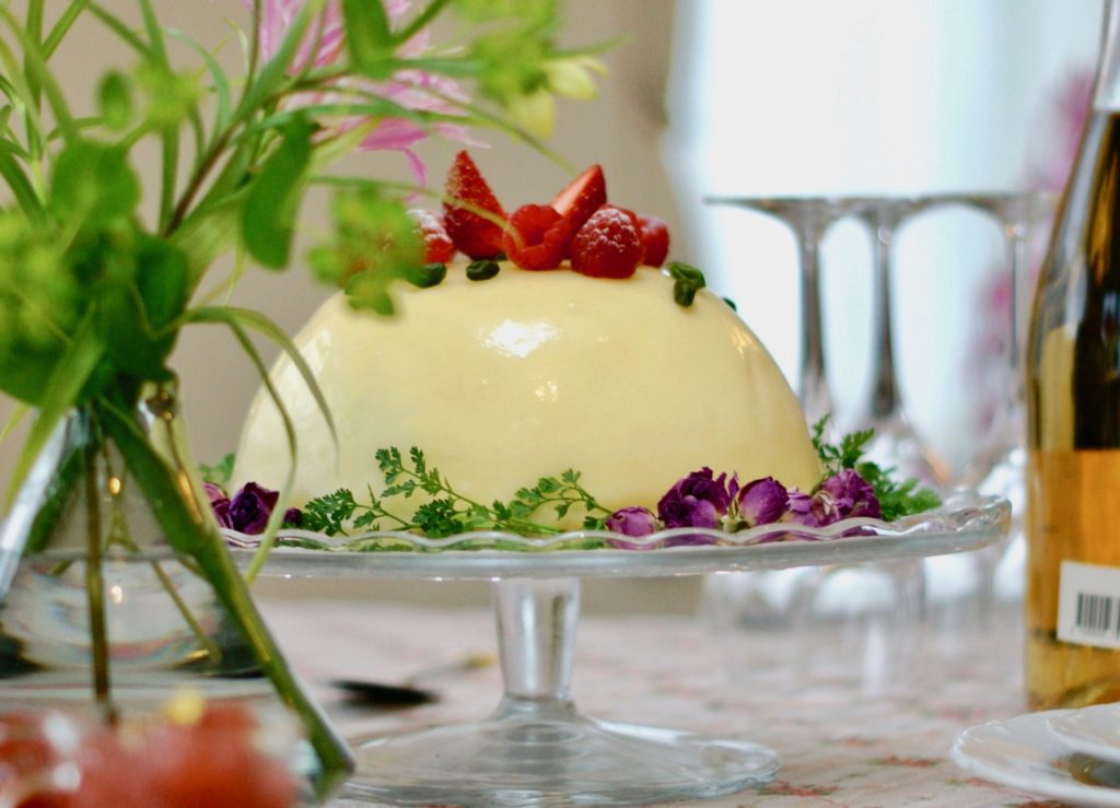 ほんわかして、ゆったりとした気持ちになっていただけたらと思い、ドーム型のケーキのフォトを選びました。表面がピカピカしているのは、ホワイトチョコレートのグラサージュがかかっているからです。2ミリの厚さで、均等に、美しく。グラサージュがけは、やり直しが聞きません。緊張の一瞬。成功すれば本当に嬉しい!