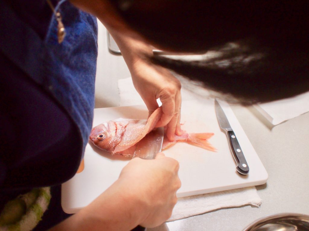 ナイフの入れる角度、左手、お魚さばきの手順(フランス料理のやり方です)、などなど。手取り足取り、みんなに声かけしながら、鯛を一尾、さばきました。
